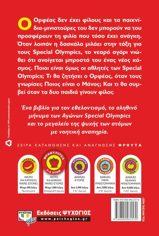 Ο Ορφέας δεν έχει φίλους και τα παιχνίδια-μινιατούρες του δεν μπορούν να του προσφέρουν τη φιλία που τόσο έχει ανάγκη. Όταν λοιπόν η δασκάλα μιλάει στην τάξη για τους Special Olympics, το νεαρό αγόρι νιώθει ότι ανοίγεται μπροστά του ένας νέος κόσμος. Ποιοι είναι όμως οι αθλητές των Special Olympics; Τι θα ζητήσει ο Ορφέας, όταν τους γνωρίσει; Ποιος είναι ο Μάνος; Kαι τι θα συμβεί όταν τα δυο παιδιά γίνουν φίλοι;Ένα βιβλίο για τον εθελοντισμό, το αληθινό μήνυμα των Αγώνων Special Olympics και το μεγαλείο της ψυχής των ατόμων με νοητική αναπηρία.