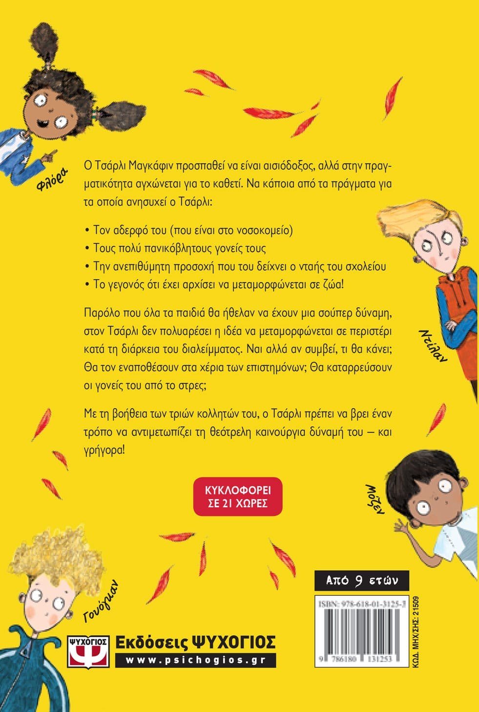 Ο Τσάρλι ΜακΓκάφιν προσπαθεί να είναι αισιόδοξος, αλλά στην πραγματικότητα αγχώνεται για το καθετί. Να κάποια από τα πράγματα για τα οποία ανησυχεί ο Τσάρλι:- τον αδελφό του, που είναι στο νοσοκομείο∙- τους πολύ πανικόβλητους γονείς τους∙- την ανεπιθύμητη προσοχή που του δείχνει ο νταής του σχολείου∙- το γεγονός ότι έχει αρχίσει να μεταμορφώνεται σε διάφορα ζώα!Παρόλο που όλα τα παιδιά θα ήθελαν να έχουν μια σούπερ δύναμη, στον Τσάρλι δεν πολυαρέσει η ιδέα να μεταμορφώνεται σε περιστέρι κατά τη διάρκεια των μαθημάτων. Ναι, αλλά, αν συμβεί, τι θα κάνει; Θα τον παραδώσουν στα χέρια των επιστημόνων; Θα καταρρεύσουν οι γονείς του από το στρες; Με τη βοήθεια των τριών κολλητών του, ο Τσάρλι πρέπει να βρει έναν τρόπο να αντιμετωπίσει τη θεότρελη καινούρια δύναμή του – και γρήγορα!