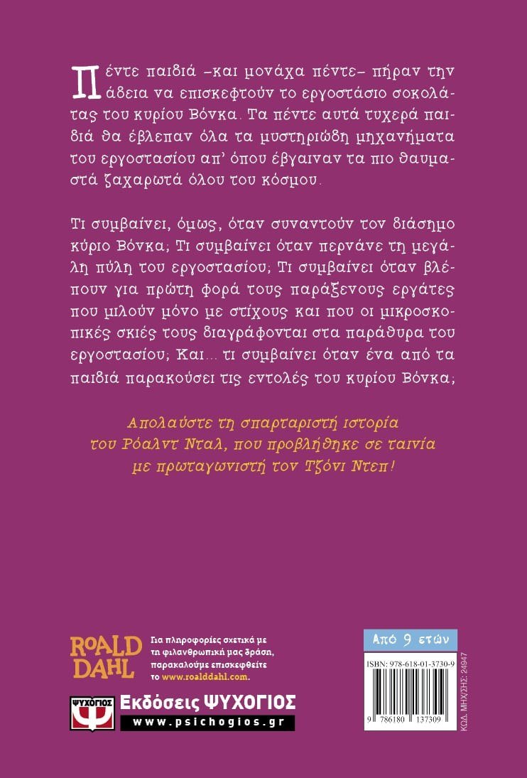 Περιπέτεια γεμάτη σοκολάτα. Πέντε παιδιά –και μονάχα πέντε– πήραν την άδεια να επισκεφτούν το εργοστάσιο σοκολάτας του κυρίου Βόνκα. Τα πέντε αυτά τυχερά παιδιά θα έβλεπαν όλα τα μυστηριώδη μηχανήματα του εργοστασίου απ’ όπου έβγαιναν τα πιο θαυμαστά ζαχαρωτά όλου του κόσμου. Τι συμβαίνει όμως όταν συναντούν τον διάσημο κύριο Βόνκα; Τι συμβαίνει όταν περνάνε τη μεγάλη πύλη του εργοστασίου; Τι συμβαίνει όταν βλέπουν για πρώτη φορά τους παράξενους εργάτες που μιλούν μόνο με στίχους και που οι μικροσκοπικές σκιές τους διαγράφονται στα παράθυρα του εργοστασίου; Και… τι συμβαίνει όταν ένα από τα παιδιά παρακούσει τις εντολές του κυρίου Βόνκα; Αυτά, αγαπητέ αναγνώστη, θα τα μάθεις όταν διαβάσεις το σπαρταριστό παραμύθι του Ρόαλντ Νταλ.