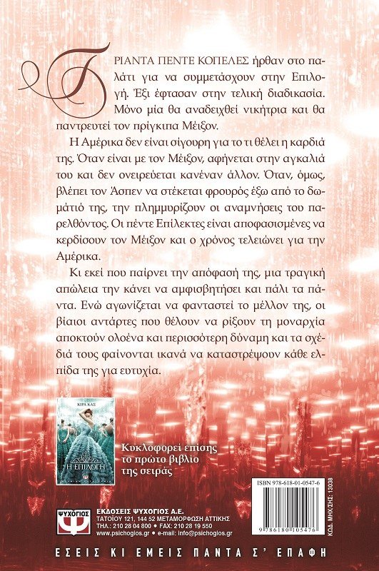 Τριάντα πέντε κοπέλες ήρθαν στο παλάτι για να συμμετάσχουν στην Επιλογή. Έξι έφτασαν στην τελική διαδικασία. Μόνο μία θα αναδειχθεί νικήτρια και θα παντρευτεί τον πρίγκιπα Μέιξον. Η Αμέρικα δεν είναι σίγουρη για το τι θέλει η καρδιά της. Όταν είναι με τον Μέιξον, αφήνεται στην αγκαλιά του και δεν ονειρεύεται κανέναν άλλον. Όταν, όμως, βλέπει τον Άσπεν να στέκεται φρουρός έξω από το δωμάτιό της, την πλημμυρίζουν οι αναμνήσεις του παρελθόντος. Οι πέντε Επίλεκτες είναι αποφασισμένες να κερδίσουν τον Μέιξον και ο χρόνος τελειώνει για την Αμέρικα.Κι εκεί που παίρνει την απόφασή της, μια τραγική απώλεια την κάνει να αμφισβητήσει και πάλι τα πάντα. Ενώ αγωνίζεται να φανταστεί το μέλλον της, οι βίαιοι αναρχικοί που θέλουν να ρίξουν τη μοναρχία αποκτούν ολοένα και περισσότερη δύναμη και τα σχέδιά τους φαίνονται ικανά να καταστρέψουν κάθε ελπίδα της για ευτυχία.