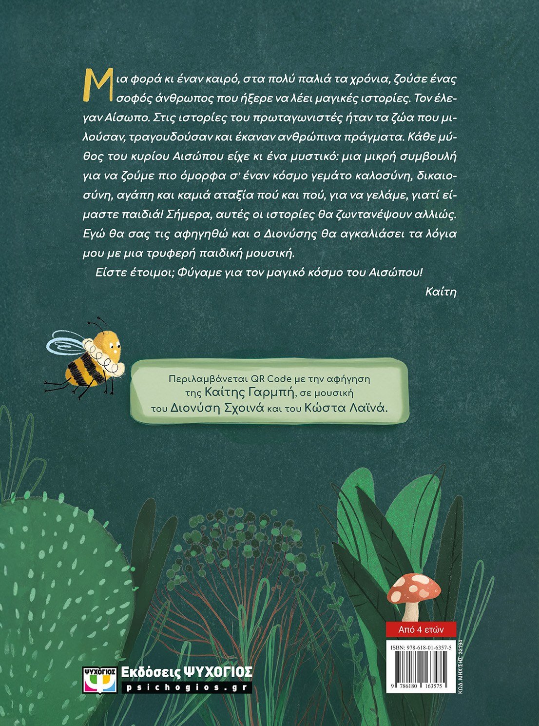 Μια φορά κι έναν καιρό, στα πολύ παλιά τα χρόνια, ζούσε ένας σοφός άνθρωπος που ήξερε να λέει μαγικές ιστορίες. Τον έλεγαν Αίσωπο. Στις ιστορίες του πρωταγωνιστές ήταν τα ζώα που μιλούσαν, τραγουδούσαν και έκαναν ανθρώπινα πράγματα. Κάθε μύθος του κυρίου Αισώπου είχε κι ένα μυστικό: μια μικρή συμβουλή για να ζούμε πιο όμορφα σ’ έναν κόσμο γεμάτο καλοσύνη, δικαιοσύνη, αγάπη και καμιά αταξία πού και πού, για να γελάμε, γιατί είμαστε παιδιά! Σήμερα, αυτές οι ιστορίες θα ζωντανέψουν αλλιώς. Εγώ θα σας τις αφηγηθώ και ο Διονύσης θα αγκαλιάσει τα λόγια μου με μια τρυφερή παιδική μουσική.Είστε έτοιμοι; Φύγαμε για τον μαγικό κόσμο του Αισώπου!ΚαίτηΠεριλαμβάνεται QR code με την αφήγηση της Καίτης Γαρμπή, σε μουσική του Διονύση Σχοινά και του Κώστα Λαϊνά.