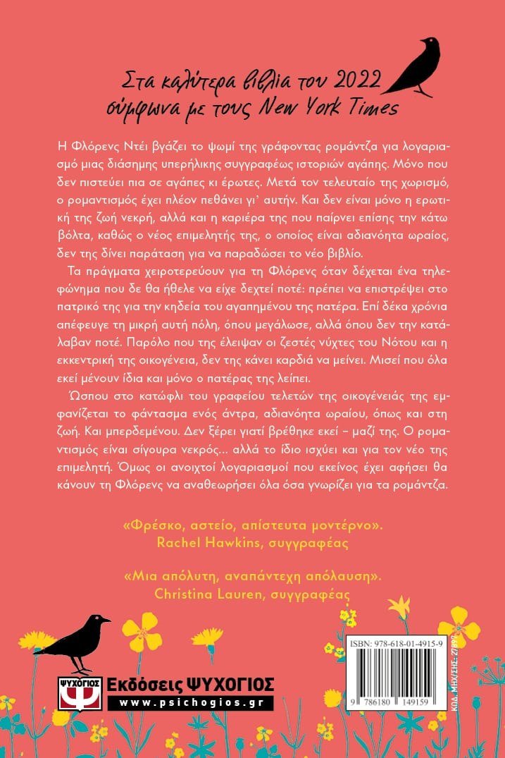ΣΤΑ ΚΑΛΥΤΕΡΑ ΒΙΒΛΙΑ ΤΟΥ 2022 ΣΥΜΦΩΝΑ ΜΕ ΤΟΥΣ NEW YORK TIMESΗ Φλόρενς Ντέι βγάζει το ψωμί της γράφοντας ρομάντζα για λογαριασμό μιας διάσημης υπερήλικης συγγραφέως ιστοριών αγάπης. Μόνο που δεν πιστεύει πια σε αγάπες κι έρωτες. Μετά τον τελευταίο της χωρισμό, ο ρομαντισμός έχει πλέον πεθάνει γ’ αυτήν. Και δεν είναι μόνο η ερωτική της ζωή νεκρή, αλλά και η καριέρα της που παίρνει επίσης την κάτω βόλτα, καθώς ο νέος επιμελητής της, ο οποίος είναι αδιανόητα ωραίος, δεν της δίνει παράταση για να παραδώσει το νέο βιβλίο. Τα πράγματα χειροτερεύουν για τη Φλόρενς όταν δέχεται ένα τηλεφώνημα που δε θα ήθελε να είχε δεχτεί ποτέ: πρέπει να επιστρέψει στο πατρικό της για την κηδεία του αγαπημένου της πατέρα. Επί δέκα χρόνια απέφευγε τη μικρή αυτή πόλη, όπου μεγάλωσε, αλλά όπου δεν την κατάλαβαν ποτέ. Παρόλο που της έλειψαν οι ζεστές νύχτες του Νότου και η εκκεντρική της οικογένεια, δεν της κάνει καρδιά να μείνει. Μισεί που όλα εκεί μένουν ίδια και μόνο ο πατέρας της λείπει. Ώσπου στο κατώφλι του γραφείου τελετών της οικογένειάς της εμφανίζεται το φάντασμα ενός άντρα, αδιανόητα ωραίου, όπως και στη ζωή. Και μπερδεμένο. Δεν ξέρει γιατί βρέθηκε εκεί – μαζί της. Ο ρομαντισμός είναι σίγουρα νεκρός… αλλά το ίδιο ισχύει και για τον νέο της επιμελητή. Όμως οι ανοιχτοί λογαριασμοί που εκείνος έχει αφήσει θα κάνουν τη Φλόρενς να αναθεωρήσει όλα όσα γνωρίζει για τα ρομάντζα.