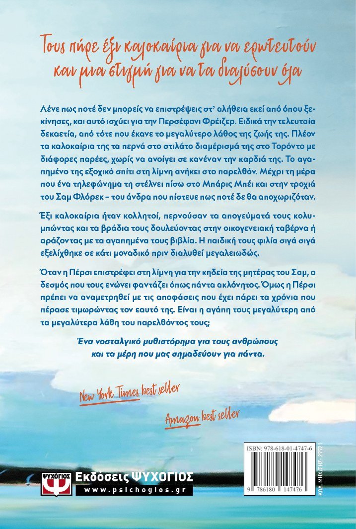 Τους πήρε έξι καλοκαίρια για να ερωτευτούν και μια στιγμή για να τα διαλύσουν όλαΛένε πως ποτέ δεν μπορείς να επιστρέψεις στ’ αλήθεια εκεί από όπου ξεκίνησες, και αυτό ισχύει για την Περσέφονι Φρέιζερ. Ειδικά την τελευταία δεκαετία, από τότε που έκανε το μεγαλύτερο λάθος της ζωής της. Πλέον τα καλοκαίρια της τα περνά στο στιλάτο διαμέρισμά της στο Τορόντο με διάφορες παρέες, χωρίς να ανοίγει σε κανέναν την καρδιά της. Το αγαπημένο της εξοχικό σπίτι στη λίμνη ανήκει στο παρελθόν. Μέχρι τη μέρα που ένα τηλεφώνημα τη στέλνει πίσω στο Μπάρις Μπέι και στην τροχιά του Σαμ Φλόρεκ – του άνδρα που πίστευε πως ποτέ δε θα αποχωριζόταν. Έξι καλοκαίρια ήταν κολλητοί, περνούσαν τα απογεύματά τους κολυμπώντας και τα βράδια τους δουλεύοντας στην οικογενειακή ταβέρνα ή αράζοντας με τα αγαπημένα τους βιβλία. Η παιδική τους φιλία σιγά σιγά εξελίχθηκε σε κάτι μοναδικό πριν διαλυθεί μεγαλειωδώς. Όταν η Πέρσι επιστρέφει στη λίμνη για την κηδεία της μητέρας του Σαμ, ο δεσμός που τους ενώνει φαντάζει όπως πάντα ακλόνητος. Όμως η Πέρσι πρέπει να αναμετρηθεί με τις αποφάσεις που έχει πάρει τα χρόνια που πέρασε τιμωρώντας τον εαυτό της. Είναι η αγάπη τους μεγαλύτερη από τα μεγαλύτερα λάθη του παρελθόντος τους;Ένα νοσταλγικό μυθιστόρημα για τους ανθρώπους και τα μέρη που μας σημαδεύουν για πάντα.