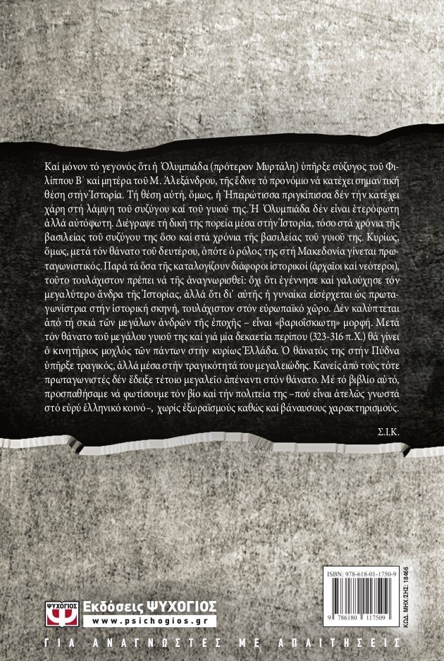Καί μόνον τό γεγονός ὅτι ἡ Ὀλυμπιάδα (πρότερον Μυρτάλη) ὑπῆρξε σύζυγος τοῦ Φιλίππου Β΄ καί μητέρα τοῦ Μ. Ἀλεξάνδρου, τῆς ἔδινε τό προνόμιο νά κατέχει σημαντική θέση στήν Ἱστορία. Τή θέση αὐτή, ὅμως, ἡ Ἠπειρώτισσα πριγκίπισσα δέν τήν κατέχει χάρη στή λάμψη τοῦ συζύγου καί τοῦ γυιοῦ της. Ἡ Ὀλυμπιάδα δέν εἶναι ἑτερόφωτη ἀλλά αὐτόφωτη. Διέγραψε τή δική της πορεία μέσα στήν Ἱστορία, τόσο στά χρόνια τῆς βασιλείας τοῦ συζύγου της ὅσο καί στά χρόνια τῆς βασιλείας τοῦ γυιοῦ της. Κυρίως, ὅμως, μετά τόν θάνατο τοῦ δευτέρου, ὁπότε ὁ ρόλος της στή Μακεδονία γίνεται πρωταγωνιστικός. Παρά τά ὅσα τῆς καταλογίζουν διάφοροι ἱστορικοί (ἀρχαῖοι καί νεότεροι), τοῦτο τουλάχιστον πρέπει νά τῆς ἀναγνωρισθεῖ: ὄχι ὅτι ἐγέννησε καί γαλούχησε τόν μεγαλύτερο ἄνδρα τῆς Ἱστορίας, ἀλλά ὅτι δι᾽ αὐτῆς ἡ γυναίκα εἰσέρχεται ὡς πρωταγωνίστρια στήν ἱστορική σκηνή, τουλάχιστον στόν εὐρωπαϊκό χῶρο. Δέν καλύπτεται ἀπό τή σκιά τῶν μεγάλων ἀνδρῶν τῆς ἐποχῆς – εἶναι «βαριοΐσκιωτη» μορφή. Μετά τόν θάνατο τοῦ μεγάλου γυιοῦ της καί γιά μία δεκαετία περίπου (323-316 π.Χ.) θά γίνει ὁ κινητήριος μοχλός τῶν πάντων στήν κυρίως Ἑλλάδα. Ὁ θάνατός της στήν Πύδνα ὑπῆρξε τραγικός, ἀλλά μέσα στήν τραγικότητά του μεγαλειώδης. Κανείς ἀπό τούς τότε πρωταγωνιστές δέν ἔδειξε τέτοιο μεγαλεῖο ἀπέναντι στόν θάνατο. Μέ τό βιβλίο αὐτό, προσπαθήσαμε νά φωτίσουμε τόν βίο καί τήν πολιτεία της -πού εἶναι ἀτελῶς γνωστά στό εὐρύ ἑλληνικό κοινό-, χωρίς ἐξωραϊσμούς καθώς καί βάναυσους χαρακτηρισμούς. Σ.Ι.Κ.