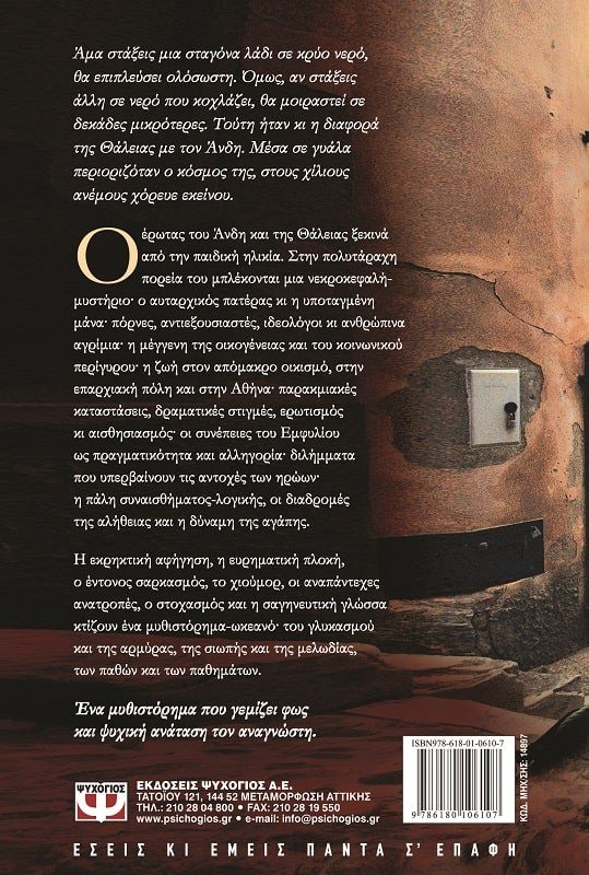 Άμα στάξεις μια σταγόνα λάδι σε κρύο νερό, θα επιπλεύσει ολόσωστη. Όμως, αν στάξεις άλλη σε νερό που κοχλάζει, θα μοιραστεί σε δεκάδες μικρότερες. Τούτη ήταν κι η διαφορά της Θάλειας με τον Άνδη. Μέσα σε γυάλα περιοριζόταν ο κόσμος της, στους χίλιους ανέμους χόρευε εκείνου. Ο έρωτας του Άνδη και της Θάλειας ξεκινά από την παιδική ηλικία. Στην πολυτάραχη πορεία του μπλέκονται μια νεκροκεφαλή-μυστήριο· ο αυταρχικός πατέρας κι η υποταγμένη μάνα· πόρνες, αντιεξουσιαστές, ιδεολόγοι κι ανθρώπινα αγρίμια· η μέγγενη της οικογένειας και του κοινωνικού περίγυρου· η ζωή στον απόμακρο οικισμό, στην επαρχιακή πόλη και στην Αθήνα· παρακμιακές καταστάσεις, δραματικές στιγμές, ερωτισμός κι αισθησιασμός· οι συνέπειες του Εμφυλίου ως πραγματικότητα και αλληγορία· διλήμματα που υπερβαίνουν τις αντοχές των ηρώων· η πάλη συναισθήματος-λογικής, οι διαδρομές της αλήθειας και η δύναμη της αγάπης.Η εκρηκτική αφήγηση, η ευρηματική πλοκή, ο έντονος σαρκασμός, το χιούμορ, οι αναπάντεχες ανατροπές, ο στοχασμός και η σαγηνευτική γλώσσα κτίζουν ένα μυθιστόρημα-ωκεανό· του γλυκασμού και της αρμύρας, της σιωπής και της μελωδίας, των παθών και των παθημάτων.Ένα μυθιστόρημα που γεμίζει φως και ψυχική ανάταση τον αναγνώστη.
