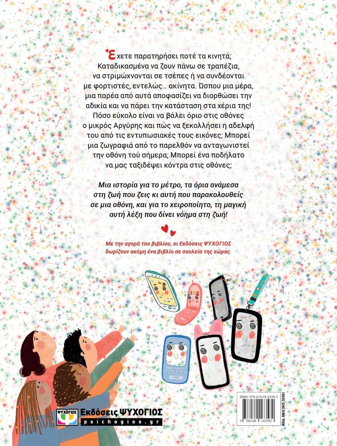 Με την αγορά του βιβλίου, οι Εκδόσεις ΨΥΧΟΓΙΟΣ δωρίζουν ακόμη ένα βιβλίο σε σχολεία της χώρας.Έχετε παρατηρήσει ποτέ τα κινητά; Καταδικασμένα να ζουν πάνω σε τραπέζια, να στριμώχνονται σε τσέπες ή να συνδέονται με φορτιστές, εντελώς… ακίνητα. Ώσπου μια μέρα, μια παρέα από αυτά αποφασίζει να διορθώσει την αδικία και να πάρει την κατάσταση στα χέρια της! Πόσο εύκολο είναι να βάλει όριο στις οθόνες ο μικρός Αργύρης και πώς να ξεκολλήσει η αδελφή του από τις εντυπωσιακές τους εικόνες; Μπορεί μια ζωγραφιά από το παρελθόν να ανταγωνιστεί την οθόνη τού σήμερα; Μπορεί ένα ποδήλατο να μας ταξιδέψει κόντρα στις οθόνες; Μια ιστορία για το μέτρο, τα όρια ανάμεσα στη ζωή που ζεις κι αυτή που παρακολουθείς σε μια οθόνη, και για το χειροποίητο, τη μαγική αυτή λέξη που δίνει νόημα στη ζωή!Το πολυαγαπημένο βιβλίο τώρα με σκληρό εξώφυλλο και νέο πρόλογο του συγγραφέα.