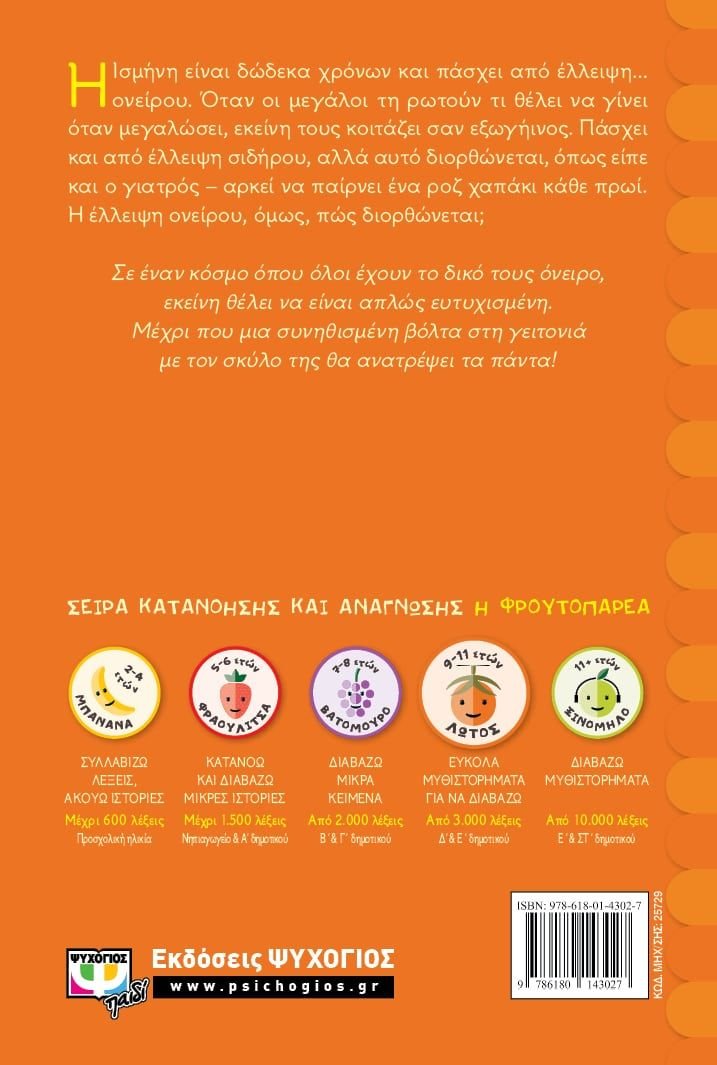 H Ισμήνη είναι δώδεκα χρόνων και πάσχει από έλλειψη… ονείρου. Όταν οι μεγάλοι τη ρωτούν τι θέλει να γίνει όταν μεγαλώσει, εκείνη τους κοιτάζει σαν εξωγήινος. Πάσχεικαι από έλλειψη σιδήρου, αλλά αυτό διορθώνεται, όπως είπε και ο γιατρός – αρκεί να παίρνει ένα ροζ χαπάκι κάθε πρωί. Η έλλειψη ονείρου, όμως, πώς διορθώνεται;Σε έναν κόσμο όπου όλοι έχουν το δικό τους όνειρο, εκείνη θέλει να είναι απλώς ευτυχισμένη. Μέχρι που μια συνηθισμένη βόλτα στη γειτονιά με τον σκύλο της θα ανατρέψει τα πάντα!