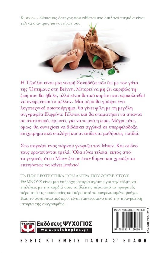Κι αν ο… δύσοσμος άστεγος που κάθεται στο διπλανό παγκάκι είναι τελικά ο άντρας των ονείρων σου; Η Τζούλια είναι μια νεαρή Σουηδέζα που ζει με τον γάτο της Όπτιμους στη Βιέννη. Μπορεί να μη ζει ακριβώς τη ζωή που θα ήθελε, αλλά είναι θετικό κορίτσι και εξακολουθεί να ονειρεύεται το μέλλον. Μια μέρα θα γράψει ένα λογοτεχνικό αριστούργημα, θα γίνει φίλη με τη μεγάλη συγγραφέα Ελφρίντε Γέλινεκ και θα σταματήσει να απαντά σε στατιστικές έρευνες για να περνά η ώρα. Μέχρι τότε όμως, θα συνεχίσει να διδάσκει αγγλικά σε υπερφιλόδοξα επιχειρηματικά στελέχη και ανεπίδεκτα μαθήσεως παιδιά. Στο παγκάκι ενός πάρκου γνωρίζει τον Μπεν. Και οι δυο τους ερωτεύονται τρελά. Όλα είναι τέλεια, εκτός από το γεγονός ότι ο Μπεν ζει σε έναν θάμνο και χρειάζεται επειγόντως να κάνει μπάνιο! Το ΠΩΣ ΕΡΩΤΕΥΤΗΚΑ ΤΟΝ ΑΝΤΡΑ ΠΟΥ ΖΟΥΣΕ ΣΤΟΥΣ ΘΑΜΝΟΥΣ είναι μια υπέροχη ιστορία αγάπης για την τόλμη να επιλέγεις με την καρδιά σου, να βλέπεις πέρα από το προφανές, πέρα από τις προσδοκίες και πέρα από τα κουρελιασμένα ρούχα. Και, το συναρπαστικότερο, είναι εμπνευσμένο από την πραγματική ιστορία της συγγραφέως.
