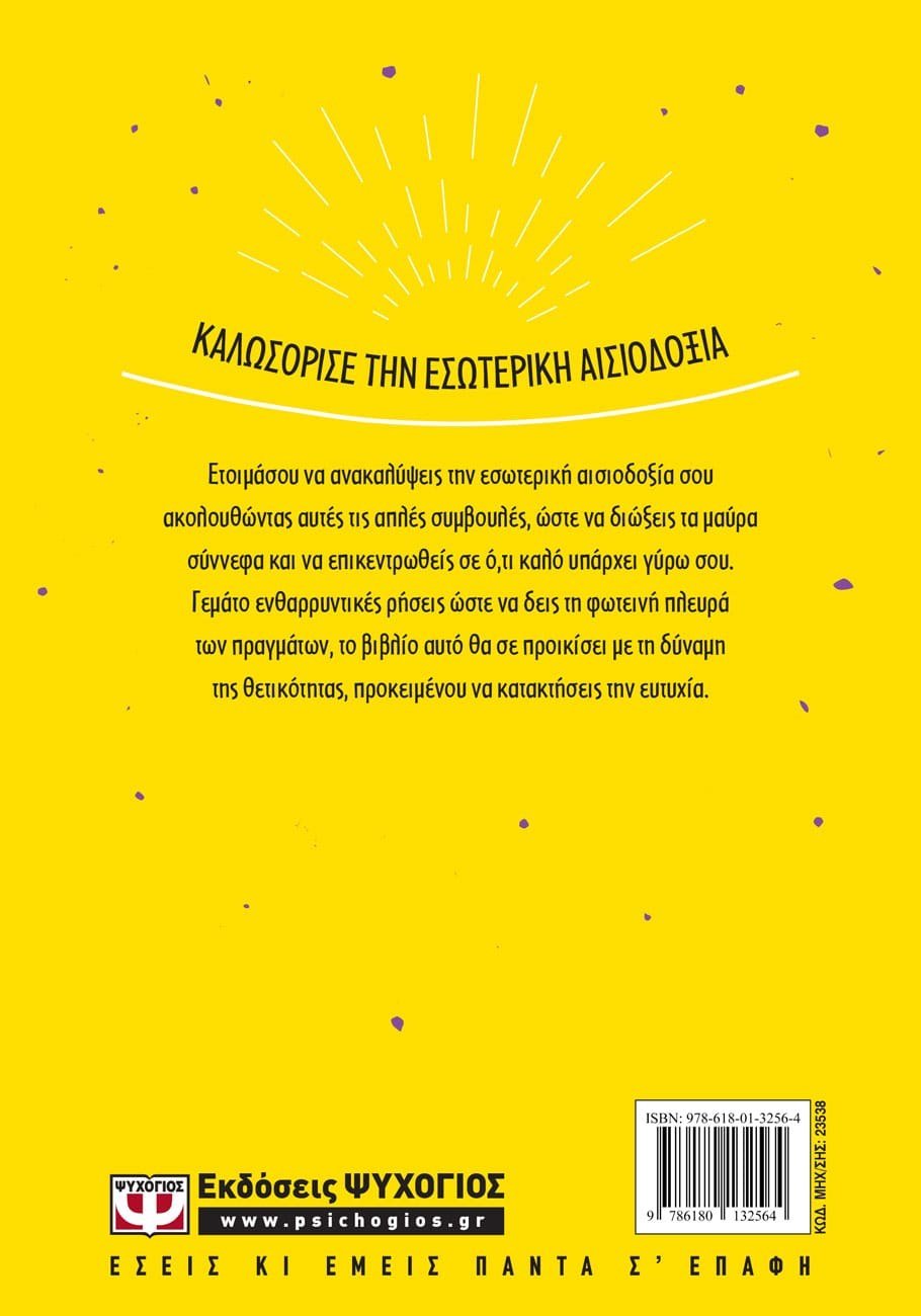 ΚΑΛΩΣΟΡΙΣΕ ΤΗΝ ΕΣΩΤΕΡΙΚΗ ΑΙΣΙΟΔΟΞΙΑΕτοιμάσου να ανακαλύψεις την εσωτερική αισιοδοξία σου ακολουθώντας αυτές τις απλές συμβουλές, ώστε να διώξεις τα μαύρα σύννεφα και να επικεντρωθείς σε ό,τι καλό υπάρχει γύρω σου. Γεμάτο ενθαρρυντικές ρήσεις για να σε βοηθήσουν να δεις τη φωτεινή πλευρά των πραγμάτων, το βιβλίο αυτό θα σε προικίσει με τη δύναμη της θετικότητας, προκειμένου να κατακτήσεις την ευτυχία.