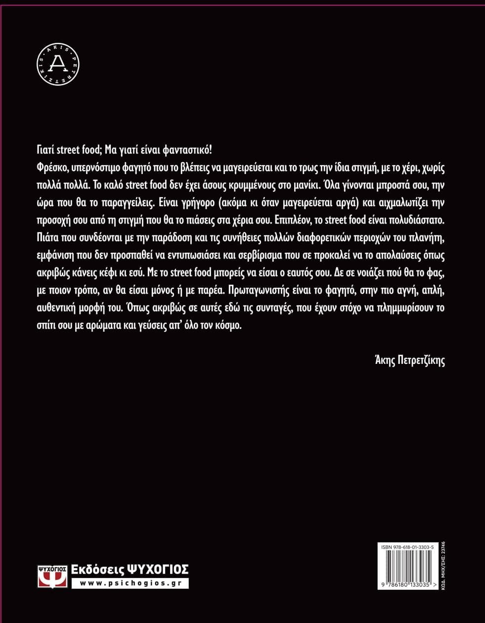 Γιατί Street Food; Μα γιατί είναι φανταστικό!Φρέσκο, υπερνόστιμο φαγητό που το βλέπεις να μαγειρεύεται και το τρως την ίδια στιγμή, με το χέρι, χωρίς πολλά πολλά. Το καλό street food δεν έχει άσους κρυμμένους στο μανίκι. Όλα γίνονται μπροστά σου, την ώρα που θα το παραγγείλεις. Είναι γρήγορο (ακόμα κι όταν μαγειρεύεται αργά) και αιχμαλωτίζει την προσοχή σου από τη στιγμή που θα το πιάσεις στα χέρια σου. Επιπλέον, το street food είναι πολυδιάστατο. Πιάτα που συνδέονται με την παράδοση και τις συνήθειες πολλών διαφορετικών περιοχών του πλανήτη, εμφάνιση που δεν προσπαθεί να εντυπωσιάσει και σερβίρισμα που σε προκαλεί να το απολαύσεις όπως ακριβώς κάνεις κέφι εσύ. Με το street food μπορείς να είσαι ο εαυτός σου. Δε σε νοιάζει πού θα το φας, με ποιον τρόπο, αν θα είσαι μόνος ή με παρέα. Πρωταγωνιστής είναι το φαγητό, στην πιο αγνή, απλή αυθεντική μορφή του. Όπως ακριβώς σε αυτές εδώ τις συνταγές, που έχουν στόχο να πλημμυρίσουν το σπίτι σου με αρώματα και γεύσεις απ’ όλο τον κόσμο. Άκης Πετρετζίκης