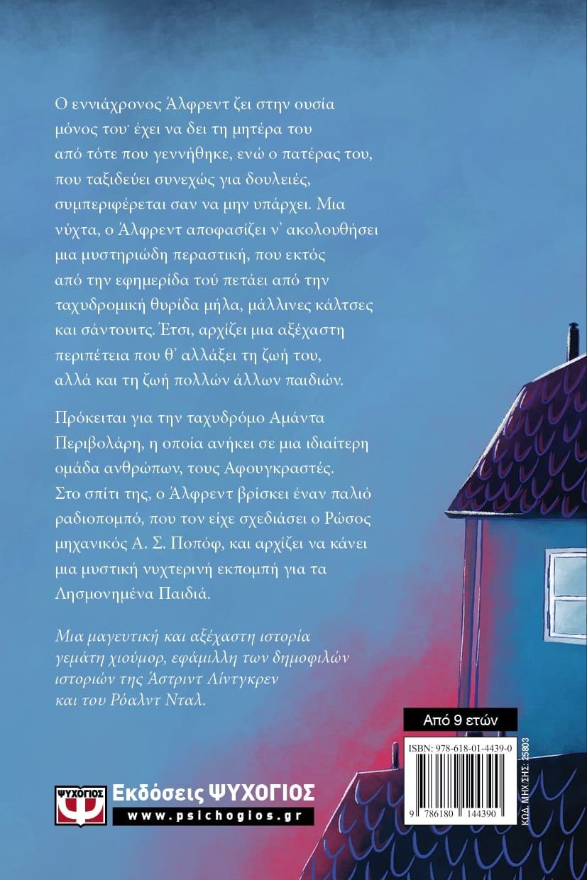 Ο εννιάχρονος Άλφρεντ ζει στην ουσία μόνος του· έχει να δει τη μητέρα του από τότε που γεννήθηκε, ενώ ο πατέρας του, που ταξιδεύει συνεχώς για δουλειές, συμπεριφέρεται σαν να μην υπάρχει. Μια νύχτα, ο Άλφρεντ αποφασίζει ν’ ακολουθήσει μια μυστηριώδη περαστική, που εκτός από την εφημερίδα τού πετάει από την ταχυδρομική θυρίδα μήλα, μάλλινες κάλτσες και σάντουιτς. Έτσι, αρχίζει μια αξέχαστη περιπέτεια που θ’ αλλάξει τη ζωή του, αλλά και τη ζωή πολλών άλλων παιδιών. Πρόκειται για την ταχυδρόμο Αμάντα Περιβολάρη, η οποία ανήκει σε μια ιδιαίτερη ομάδα ανθρώπων, τους Αφουγκραστές. Στο σπίτι της, ο Άλφρεντ βρίσκει έναν παλιό ραδιοπομπό, που τον είχε σχεδιάσει ο Ρώσος μηχανικός Α. Σ. Ποπόφ, και αρχίζει να κάνει μια μυστική νυχτερινή εκπομπή για τα Λησμονημένα Παιδιά.Μια μαγευτική και αξέχαστη ιστορία γεμάτη χιούμορ, εφάμιλλη των δημοφιλών ιστοριών της Άστριντ Λίντγκρεν και του Ρόαλντ Νταλ.