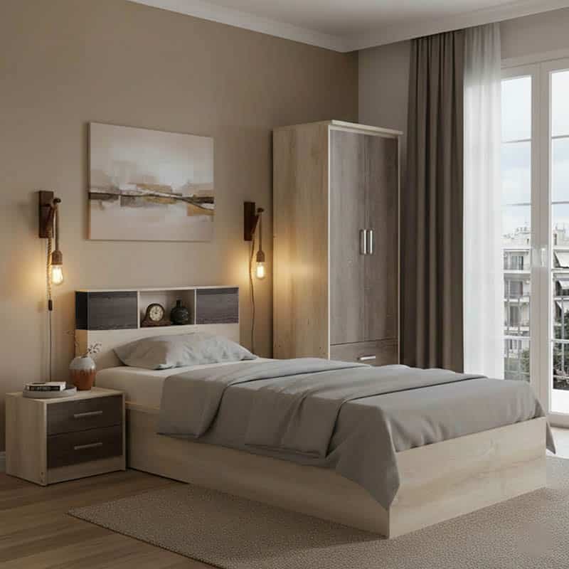Το σετ αποτελείται απο 1 κρεβάτι, 1 κομοδίνο και μια ντουλάπα