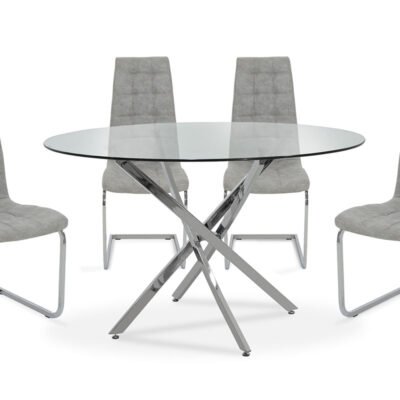 Τραπεζαρία Steve σετ 5τμχ διάφανο γυαλί-κάθισμα antique γκρι pu Φ120×74,5εκ