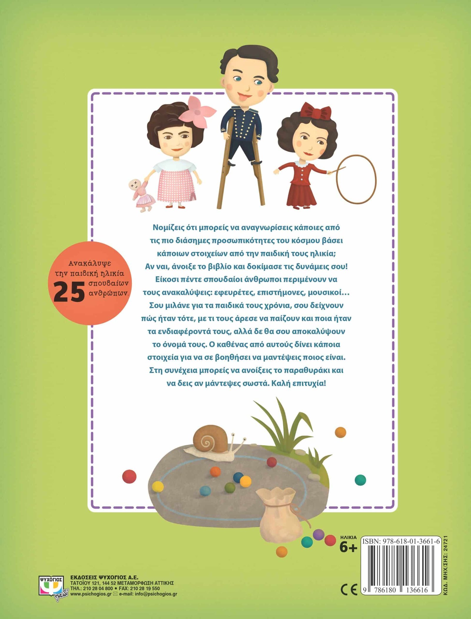 Νομίζεις ότι μπορείς να αναγνωρίσεις κάποιες απότις πιο διάσημες προσωπικότητες του κόσμου βάσεικάποιων στοιχείων από την παιδική τους ηλικία;Αν ναι, άνοιξε το βιβλίο και δοκίμασε τις δυνάμεις σου!Είκοσι πέντε σπουδαίοι άνθρωποι περιμένουν νατους ανακαλύψεις: εφευρέτες, επιστήμονες, μουσικοί…Σου μιλάνε για τα παιδικά τους χρόνια, σου δείχνουνπώς ήταν τότε, με τι τους άρεσε να παίζουν και ποια ήταντα ενδιαφέροντά τους, αλλά δε θα σου αποκαλύψουντο όνομά τους. Ο καθένας από αυτούς δίνει κάποιαστοιχεία για να σε βοηθήσει να μαντέψεις ποιος είναι.Στη συνέχεια μπορείς να ανοίξεις το παραθυράκι καινα δεις αν μάντεψες σωστά. Καλή επιτυχία!