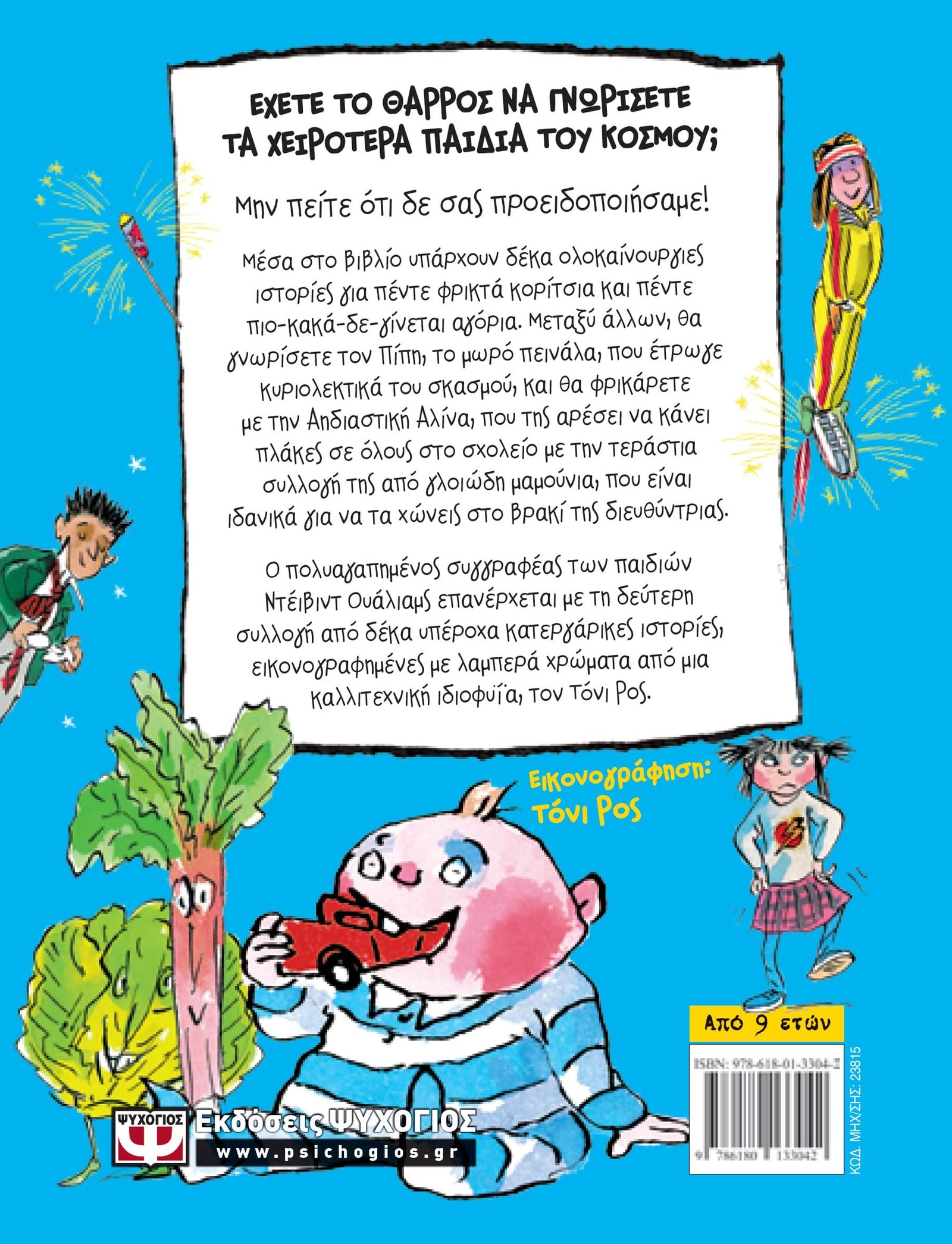 ΕΧΕΤΕ ΤΟ ΘΑΡΡΟΣ ΝΑ ΓΝΩΡΙΣΕΤΕ ΤΑ ΧΕΙΡΟΤΕΡΑ ΠΑΙΔΙΑ ΤΟΥ ΚΟΣΜΟΥ;Μην πείτε ότι δε σας προειδοποιήσαμε!Μέσα στο βιβλίο υπάρχουν δέκα ολοκαίνουργιες ιστορίες για πέντε φρικτά κορίτσια και πέντε πιο-κακά-δε-γίνεται αγόρια. Μεταξύ άλλων, θα γνωρίσετε τον Πίπη, το μωρό πεινάλα, που έτρωγε κυριολεκτικά του σκασμού, και θα φρικάρετε με την Αηδιαστική Αλίνα, που της αρέσει να κάνει πλάκες σε όλους στο σχολείο με την τεράστια συλλογή της από γλοιώδη μαμούνια, που είναι ιδανικά για να τα χώνεις στο βρακί της διευθύντριας. Ο πολυαγαπημένος συγγραφέας των παιδιών Ντέιβιντ Ουάλιαμς επανέρχεται με τη δεύτερη συλλογή από δέκα υπέροχα κατεργάρικες ιστορίες, εικονογραφημένες με λαμπερά χρώματα από μια καλλιτεχνική ιδιοφυΐα, τον Τόνι Ρος.