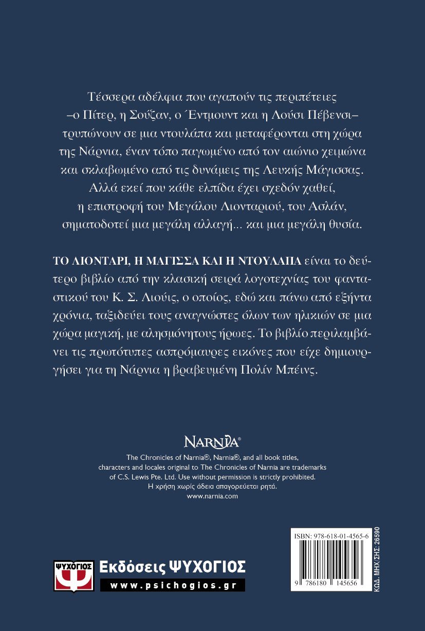 Τέσσερα αδέλφια που αγαπούν τις περιπέτειες –ο Πίτερ, η Σούζαν, ο Έντμουντ και η Λούσι Πέβενσι– τρυπώνουν σε μια ντουλάπα και μεταφέρονται στη χώρα της Νάρνια, έναν τόπο παγωμένο από τον αιώνιο χειμώνα και σκλαβωμένο από τις δυνάμεις της Λευκής Μάγισσας. Αλλά εκεί που κάθε ελπίδα έχει σχεδόν χαθεί, η επιστροφή του Μεγάλου Λιονταριού, του Ασλάν, σηματοδοτεί μια μεγάλη αλλαγή… και μια μεγάλη θυσία.ΤΟ ΛΙΟΝΤΑΡΙ, Η ΜΑΓΙΣΣΑ ΚΑΙ Η ΝΤΟΥΛΑΠΑ είναι το δεύτερο βιβλίο από την κλασική σειρά λογοτεχνίας του φανταστικού του Κ. Σ. Λιούις, ο οποίος, εδώ και πάνω από εξήντα χρόνια, ταξιδεύει τους αναγνώστες όλων των ηλικιών σε μια χώρα μαγική, με αλησμόνητους ήρωες. Το βιβλίο περιλαμβάνει τις πρωτότυπες ασπρόμαυρες εικόνες που είχε δημιουργήσει για τη Νάρνια η βραβευμένη Πολίν Μπέινς.