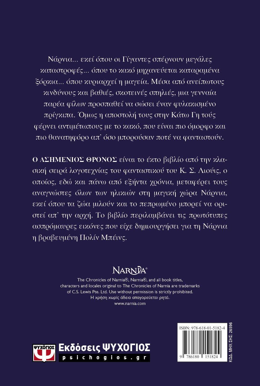 Νάρνια… εκεί όπου οι Γίγαντες σπέρνουν μεγάλες καταστροφές… όπου το κακό μηχανεύεται καταραμένα ξόρκια… όπου κυριαρχεί η μαγεία. Μέσα από ανείπωτους κινδύνους και βαθιές, σκοτεινές σπηλιές, μια γενναία παρέα φίλων προσπαθεί να σώσει έναν φυλακισμένο πρίγκιπα. Όμως η αποστολή τους στην Κάτω Γη τούς φέρνει αντιμέτωπους με το κακό, που είναι πιο όμορφο και πιο θανατηφόρο απ’ όσο μπορούσαν ποτέ να φανταστούν.Ο ΑΣΗΜΕΝΙΟΣ ΘΡΟΝΟΣ είναι το έκτο βιβλίο από την κλασική σειρά λογοτεχνίας του φανταστικού του Κ. Σ. Λιούις, ο οποίος, εδώ και πάνω από εξήντα χρόνια, μεταφέρει τους αναγνώστες όλων των ηλικιών στη μαγική χώρα Νάρνια, εκεί όπου τα ζώα μιλούν και το πεπρωμένο μπορεί να οριστεί απ’ την αρχή. Το βιβλίο περιλαμβάνει τις πρωτότυπες ασπρόμαυρες εικόνες που είχε δημιουργήσει για τη Νάρνια η βραβευμένη Πολίν Μπέινς.