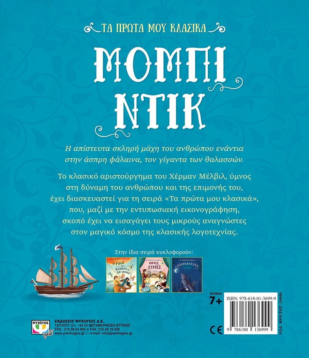 Η απίστευτα σκληρή µάχη του ανθρώπου ενάντια στην άσπρη φάλαινα, τον γίγαντα των θαλασσών. Το κλασικό αριστούργηµα του Χέρµαν Μέλβιλ, ύµνος στη δύναµη του ανθρώπου και της επιµονής του, έχει διασκευαστεί για τη σειρά «Τα πρώτα µου κλασικά», που, µαζί µε την εντυπωσιακή εικονογράφηση, σκοπό έχει να εισαγάγει τους µικρούς αναγνώστες στον µαγικό κόσµο της κλασικής λογοτεχνίας.
