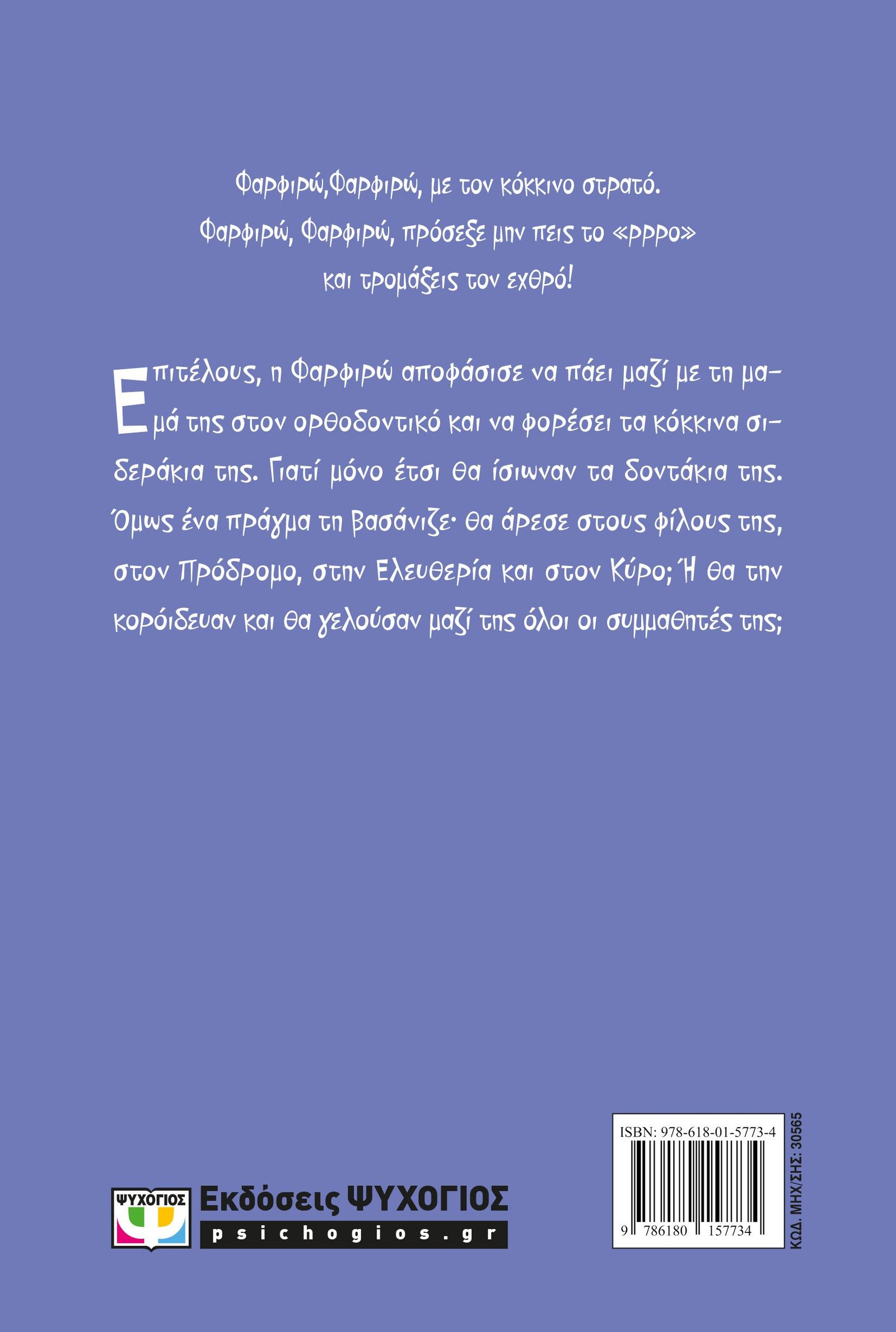 Φαρφιρώ, Φαρφιρώ, με τον κόκκινο στρατό.Φαρφιρώ, Φαρφιρώ, πρόσεξε μην πεις το «ρρρο» και τρομάξεις τον εχθρό!Επιτέλους, η Φαρφιρώ αποφάσισε να πάει μαζί με τη μαμά της στον ορθοδοντικό και να φορέσει τα κόκκινα σιδεράκια της. Γιατί μόνο έτσι θα ίσιωναν τα δοντάκια της. Όμως ένα πράγμα τη βασάνιζε· θα άρεσε στους φίλους της, στον Πρόδρομο, στην Ελευθερία και στον Κύρο; Ή θα την κορόιδευαν και θα γελούσαν μαζί της όλοι οι συμμαθητές της;
