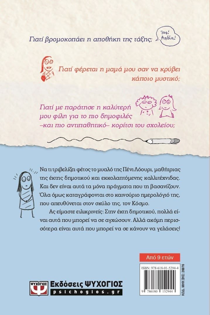 Γιατί βρομοκοπάει η αποθήκη της τάξης; Ίου! Αηδία!Γιατί φέρεται η μαμά μου σαν να κρύβει κάποιο μυστικό;Γιατί με παράτησε η καλύτερή μου φίλη για το πιο δημοφιλές –και πιο αντιπαθητικό– κορίτσι του σχολείου;Να τι τριβελίζει φέτος το μυαλό της Πένι Λόουρι, μαθήτριας της έκτης δημοτικού και εκκολαπτόμενης καλλιτέχνιδας. Και δεν είναι αυτά τα μόνα πράγματα που τη βασανίζουν.Όλα όμως καταγράφονται στο καινούριο ημερολόγιό της, που απευθύνεται στον σκύλο της, τον Κόσμο. Ας είμαστε ειλικρινείς: Στην έκτη δημοτικού, πολλά είναι αυτά που μπορεί να σε αγχώσουν. Αλλά ακόμη περισσότερα είναι αυτά που μπορεί να σε κάνουν να γελάσεις!