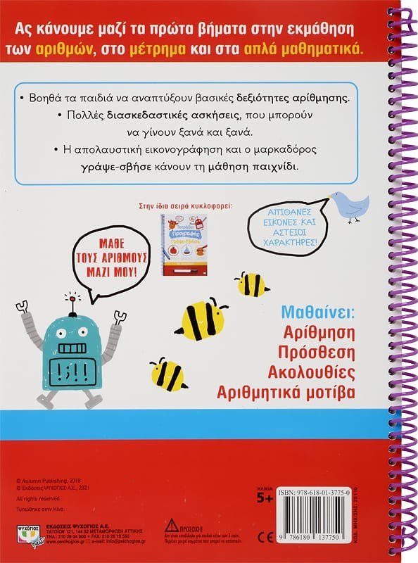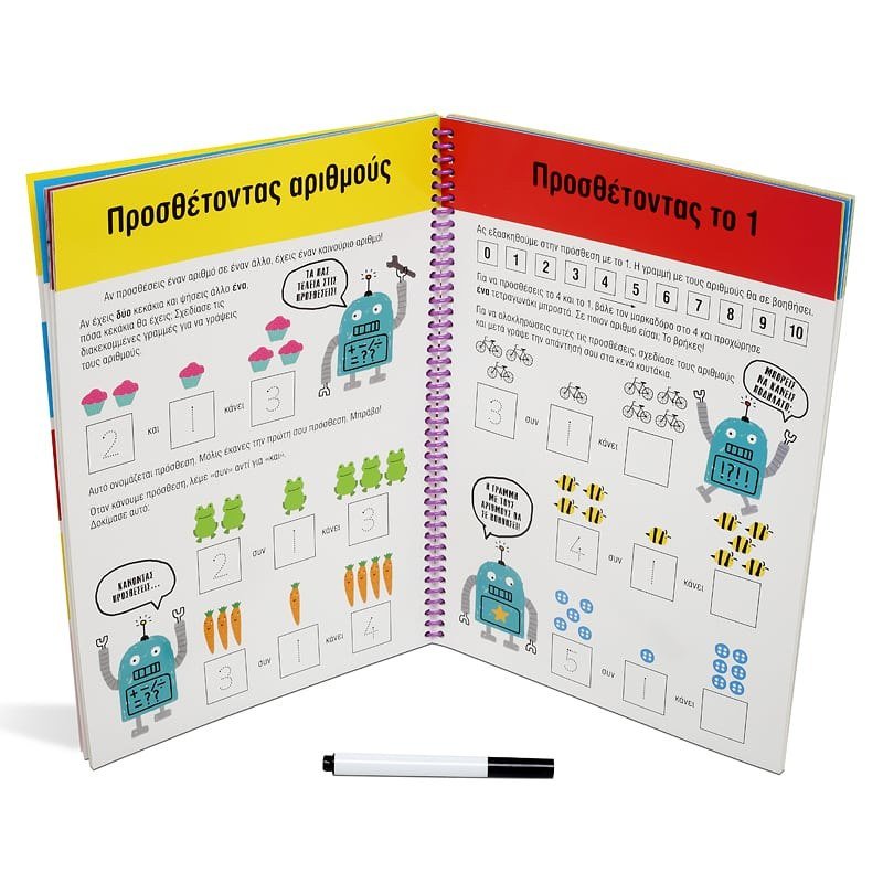 Ας κάνουμε μαζί τα πρώτα βήματα στην εκμάθηση των αριθμών, στο μέτρημα και στα απλά μαθηματικά.• Βοηθά τα παιδιά να αναπτύξουν βασικές δεξιότητες αρίθµησης.• Πολλές διασκεδαστικές ασκήσεις, που µπορούν να γίνουν ξανά και ξανά.• Η απολαυστική εικονογράφηση και ο µαρκαδόρος γράψε-σβήσε κάνουν τη µάθηση παιχνίδι.Μαθαίνει:ΑρίθμησηΠρόσθεσηΑκολουθίεςΑριθμητικά μοτίβα