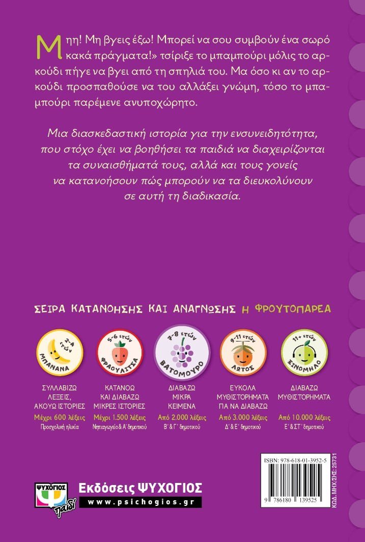 «Μηη! Μη βγεις έξω! Μπορεί να σου συμβούν ένα σωρό κακά πράγματα!» τσίριξε το μπαμπούρι μόλις το αρκούδι πήγε να βγει από τη σπηλιά του. Μα όσο κι αν το αρκούδι προσπαθούσε να του αλλάξει γνώμη, τόσο το μπαμπούρι παρέμενε ανυποχώρητο.Μια διασκεδαστική ιστορία για την ενσυνειδητότητα, που στόχο έχει να βοηθήσει τα παιδιά να διαχειρίζονται τα συναισθήματά τους, αλλά και τους γονείς να κατανοήσουν πώς μπορούν να τα διευκολύνουν σε αυτή τη διαδικασία.