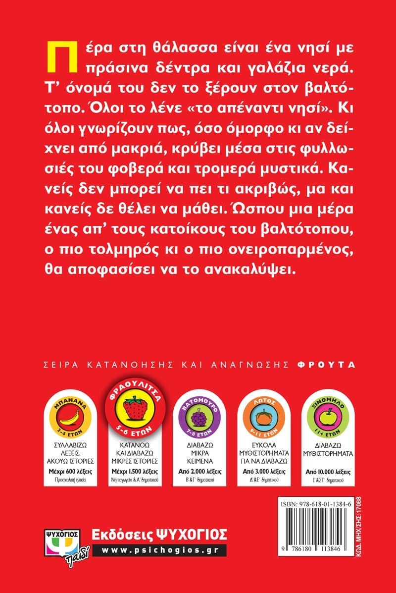 Πέρα στη θάλασσα είναι ένα νησί με πράσινα δέντρα και γαλάζια νερά. Τ’ όνομά του δεν το ξέρουν στον βαλτότοπο. Όλοι το λένε «το απέναντι νησί». Κι όλοι γνωρίζουν πως, όσο όμορφο κι αν δείχνει από μακριά, κρύβει μέσα στις φυλλωσιές του φοβερά και τρομερά μυστικά. Κανείς δεν μπορεί να πει τι ακριβώς, μα και κανείς δε θέλει να μάθει. Ώσπου μια μέρα ένας απ’ τους κατοίκους του βαλτότοπου, ο πιο τολμηρός κι ο πιο ονειροπαρμένος, θα αποφασίσει να το ανακαλύψει.