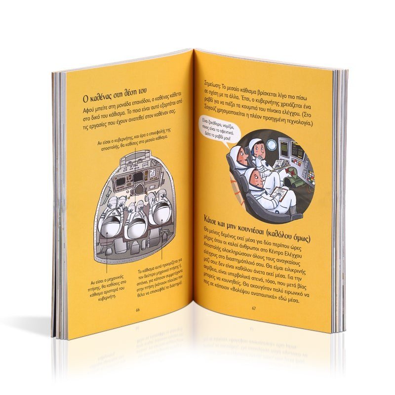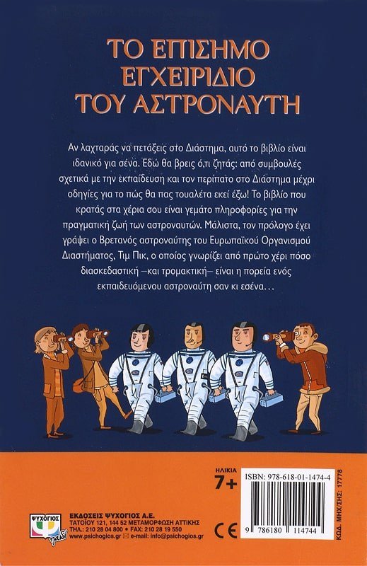Αν λαχταράς να πετάξεις στο Διάστημα, αυτό το βιβλίο είναι ιδανικό για σένα. Εδώ θα βρεις ό,τι ζητάς: από συμβουλές σχετικά με την εκπαίδευση και τον περίπατο στο Διάστημα μέχρι οδηγίες για το πώς θα πας τουαλέτα εκεί έξω! Το βιβλίο που κρατάς στα χέρια σου είναι γεμάτο πληροφορίες για την πραγματική ζωή των αστροναυτών. Μάλιστα, τον πρόλογο έχει γράψει ο Βρετανός αστροναύτης του Ευρωπαϊκού Οργανισμού Διαστήματος, Τιμ Πικ, ο οποίος γνωρίζει από πρώτο χέρι πόσο διασκεδαστική -και τρομακτική- είναι η πορεία ενός εκπαιδευόμενου αστροναύτη σαν κι εσένα…