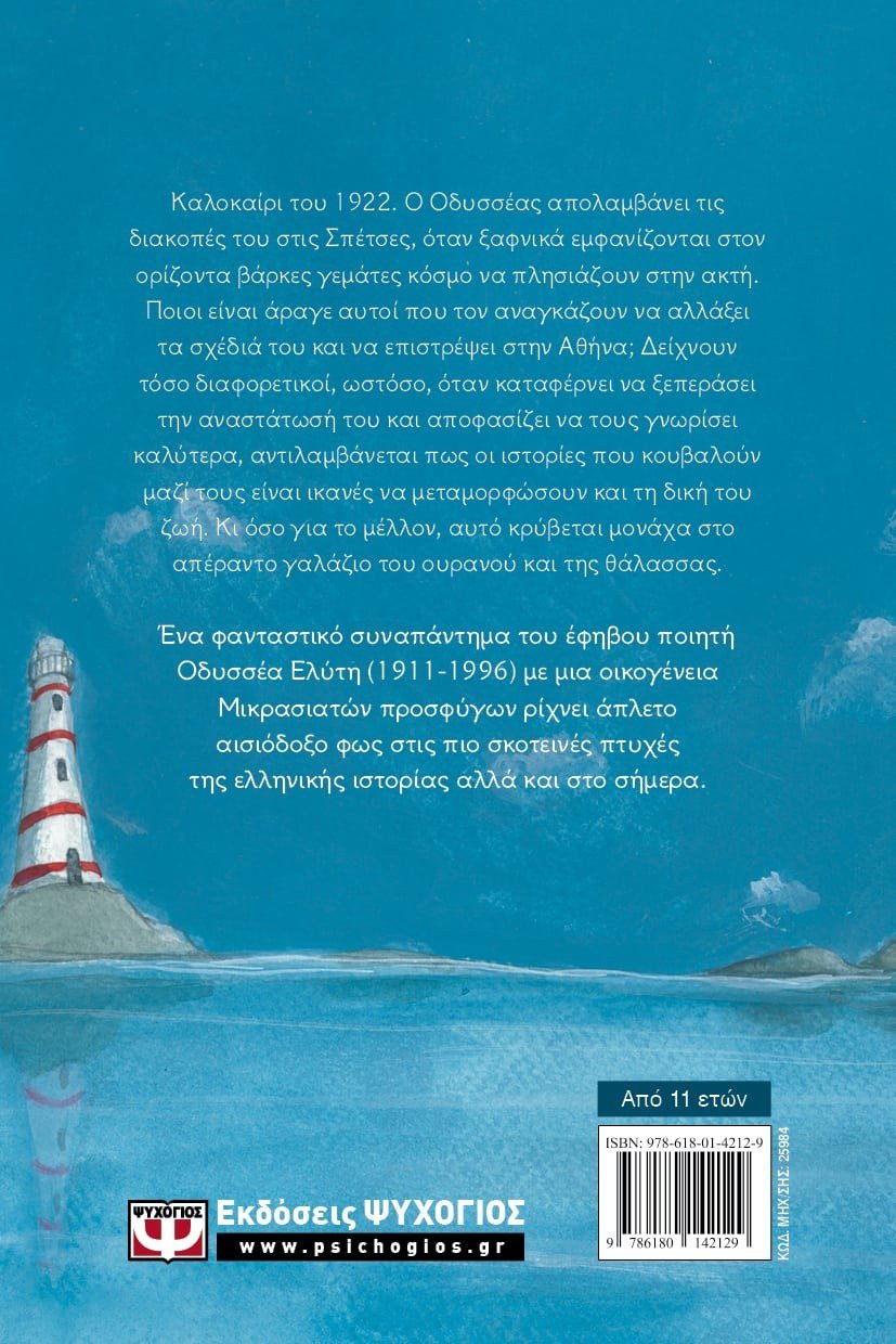 Καλοκαίρι του 1922. Ο Οδυσσέας απολαμβάνει τις διακοπές του στις Σπέτσες, όταν ξαφνικά εμφανίζονται στον ορίζοντα βάρκες γεμάτες κόσμο να πλησιάζουν στην ακτή. Ποιοι είναι άραγε αυτοί που τον αναγκάζουν να αλλάξει τα σχέδιά του και να επιστρέψει στην Αθήνα; Δείχνουν τόσο διαφορετικοί, ωστόσο, όταν καταφέρνει να ξεπεράσει την αναστάτωσή του και αποφασίζει να τους γνωρίσει καλύτερα, αντιλαμβάνεται πως οι ιστορίες που κουβαλούν μαζί τους είναι ικανές να μεταμορφώσουν και τη δική του ζωή. Κι όσο για το μέλλον, αυτό κρύβεται μονάχα στο απέραντο γαλάζιο του ουρανού και της θάλασσας. Ένα φανταστικό συναπάντημα του έφηβου ποιητή Οδυσσέα Ελύτη (1911-1996) με μια οικογένεια Μικρασιατών προσφύγων ρίχνει άπλετο αισιόδοξο φως στις πιο σκοτεινές πτυχές της ελληνικής ιστορίας αλλά και στο σήμερα.