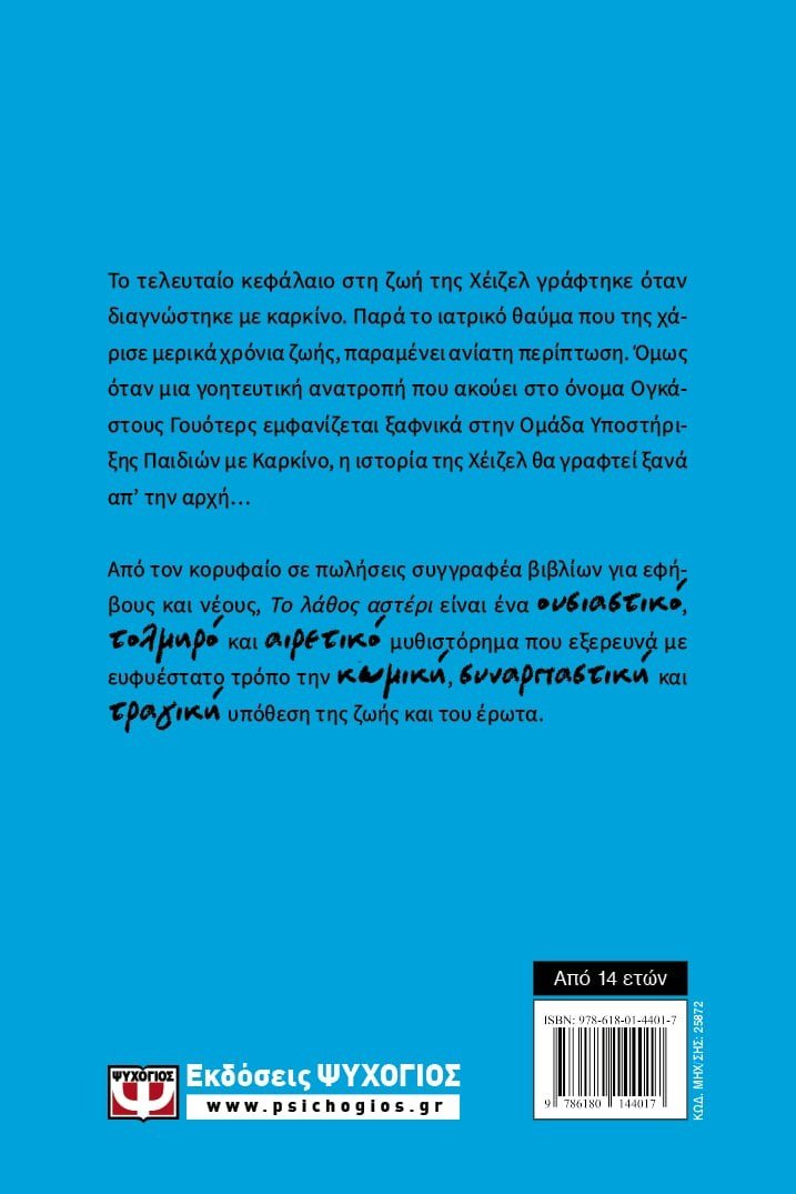 Το τελευταίο κεφάλαιο στη ζωή της Χέιζελ γράφτηκε όταν διαγνώστηκε με καρκίνο. Παρά το ιατρικό θαύμα που της χάρισε μερικά χρόνια ζωής, παραμένει ανίατη περίπτωση. Όμως όταν μια γοητευτική ανατροπή που ακούει στο όνομα Ογκάστους Γουότερς εμφανίζεται ξαφνικά στην Ομάδα Υποστήριξης Παιδιών με Καρκίνο, η ιστορία της Χέιζελ θα γραφτεί ξανά απ’ την αρχή…Από τον κορυφαίο σε πωλήσεις συγγραφέα βιβλίων για εφήβους και νέους, Το λάθος αστέρι είναι ένα ουσιαστικό, τολμηρό και αιρετικό μυθιστόρημα που εξερευνά με ευφυέστατο τρόπο την κωμική, συναρπαστική και τραγική υπόθεση της ζωής και του έρωτα.