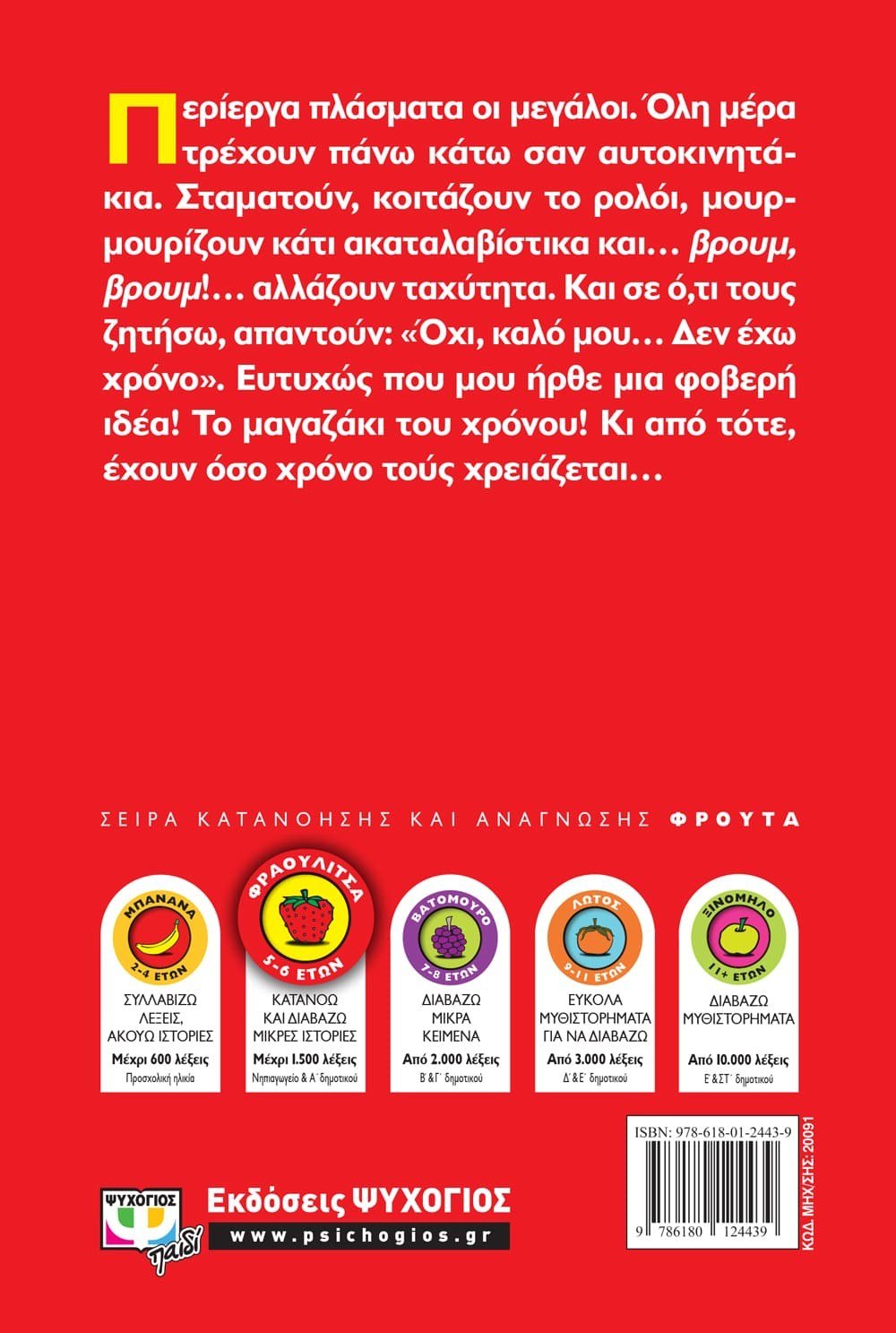 Περίεργα πλάσματα οι μεγάλοι. Όλη μέρα τρέχουν πάνω κάτω σαν αυτοκινητάκια. Σταματούν, κοιτάζουν το ρολόι, μουρμουρίζουν κάτι ακαταλαβίστικα και… βρουμ, βρουμ!… αλλάζουν ταχύτητα. Και σε ό,τι τους ζητήσω, απαντούν: «Όχι, καλό μου… Δεν έχω χρόνο». Ευτυχώς που μου ήρθε μια φοβερή ιδέα! Το μαγαζάκι του χρόνου! Κι από τότε, έχουν όσο χρόνο τούς χρειάζεται…