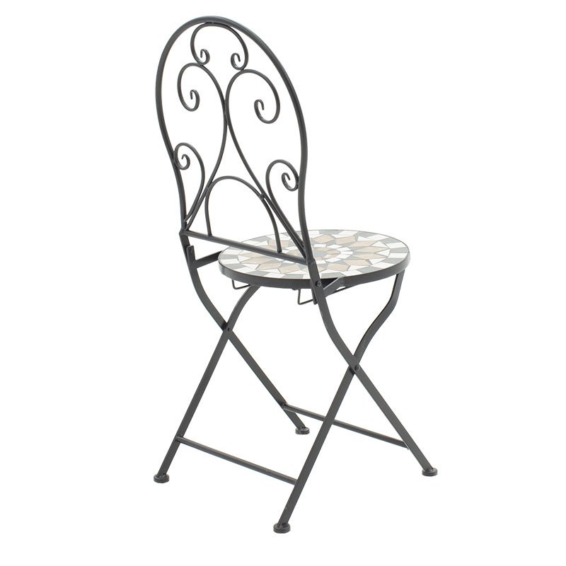 - Οι επιφάνειες του τραπεζιού και των καρεκλών φέρουν μωσαϊκό από φυσικό πλακάκι σε διάφορα χρώματα