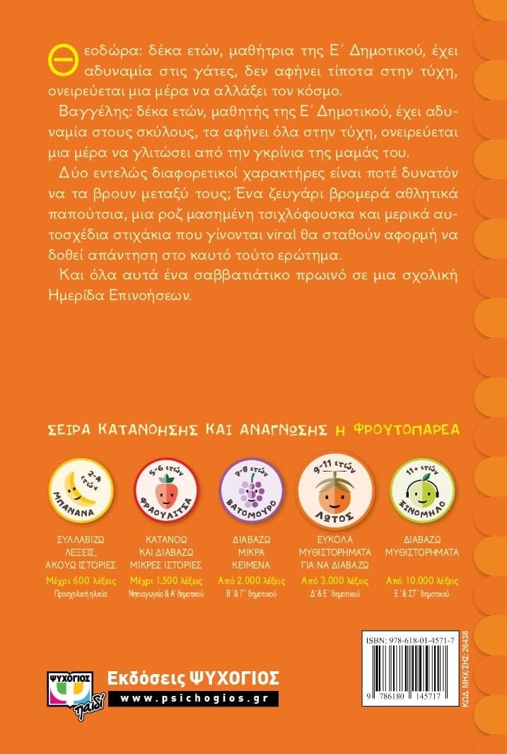 Θεοδώρα: δέκα ετών, μαθήτρια της Ε΄ Δημοτικού, έχει αδυναμία στις γάτες, δεν αφήνει τίποτα στην τύχη, ονειρεύεται μια μέρα να αλλάξει τον κόσμο.Βαγγέλης: δέκα ετών, μαθητής της Ε΄ Δημοτικού, έχει αδυναμία στους σκύλους, τα αφήνει όλα στην τύχη, ονειρεύεται μια μέρα να γλιτώσει από την γκρίνια της μαμάς του.Δύο εντελώς διαφορετικοί χαρακτήρες είναι ποτέ δυνατόν να τα βρουν μεταξύ τους; Ένα ζευγάρι βρομερά αθλητικά παπούτσια, μια ροζ μασημένη τσιχλόφουσκα και μερικά αυτοσχέδια στιχάκια που γίνονται viral θα σταθούν αφορμή να δοθεί απάντηση στο καυτό τούτο ερώτημα. Και όλα αυτά ένα σαββατιάτικο πρωινό σε μια σχολική Ημερίδα Επινοήσεων.