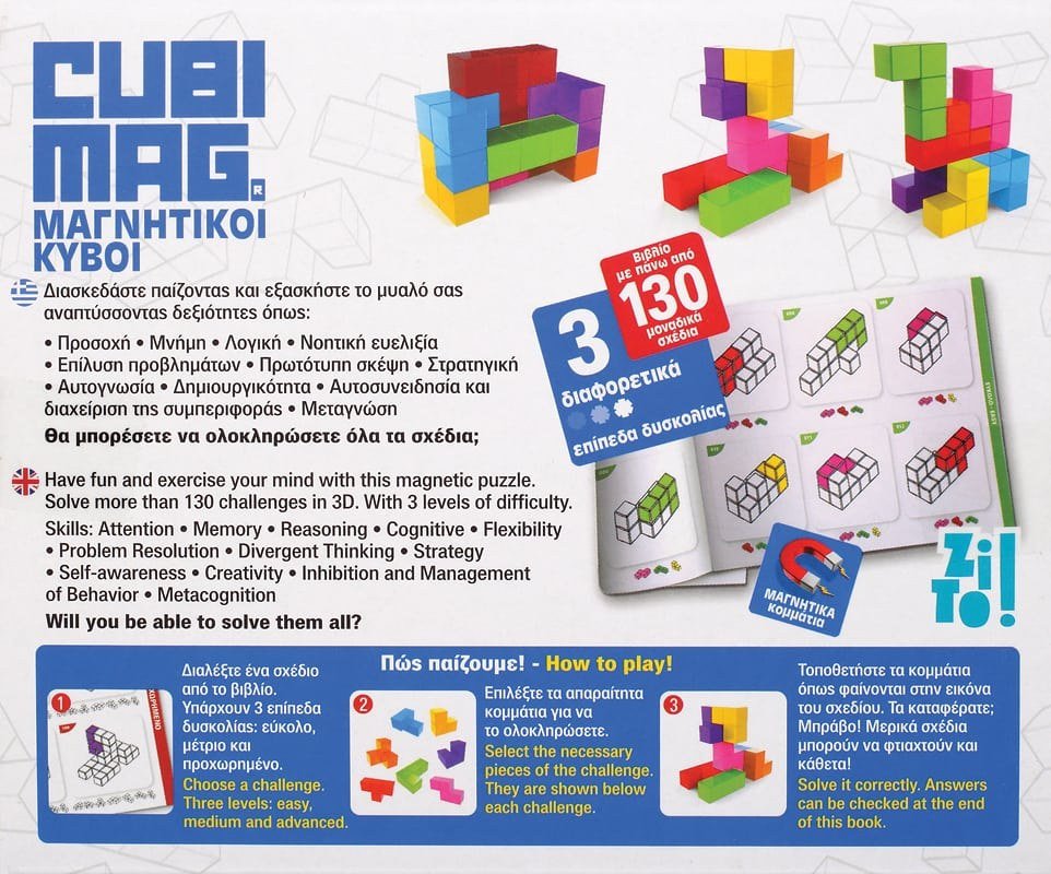 Εξασκήστε το μυαλό σας με τις πιο διασκεδαστικές σπαζοκεφαλιές, που θα σας κάνουν να… κολλήσετε. Με μαγνητικά κομμάτια, πάνω από 130 διαφορετικές σπαζοκεφαλιές και 3 διαφορετικά επίπεδα δυσκολίας, θα αναπτύξετε δεξιότητες όπως επίλυση προβλημάτων, συγκέντρωση και λογική σκέψη.Τι λέτε; Θα μπορέσετε να λύσετε όλες τις μαγνητικές σπαζοκεφαλιές;