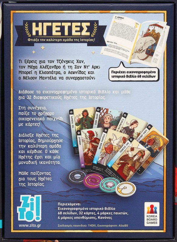 Τι ξέρεις για τον Τζένγκις Χαν, τον Μέγα Αλέξανδρο ή τη Ζαν Ντ’ Αρκ; Μπορεί η Κλεοπάτρα, ο Λεωνίδας και ο Νέλσον Μαντέλα να συνεργαστούν; Διάβασε το εικονογραφημένο ιστορικό βιβλίο και γνώρισε 32 διαφορετικούς Ηγέτες της Ιστορίας. Έπειτα, παίξε το γρήγορο οικογενειακό παιχνίδι με κάρτες! Διάλεξε Ηγέτες της Ιστορίας, δημιούργησε την καλύτερη ομάδα και κέρδισε. Ο κάθε Ηγέτης έχει και μία μοναδική ικανότητα. Μάθε παίζοντας για τους Ηγέτες της Ιστορίας.